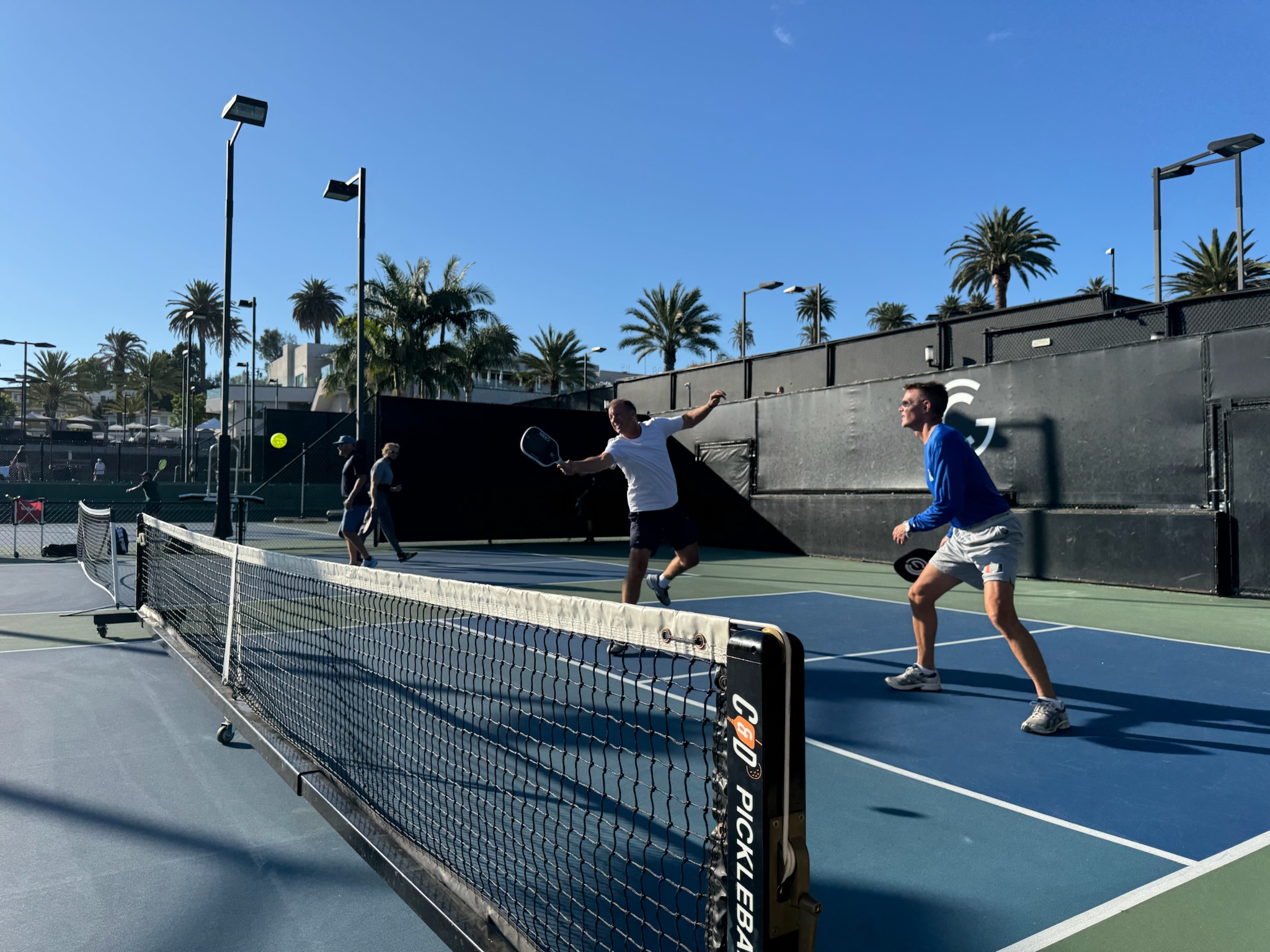 Pickleball players enjoyed four courts and two instructors who ran live-ball games and doubles games with a focus on fun play and useful tips. Non-players enjoyed visiting with friends on the private deck with a view of the courts.